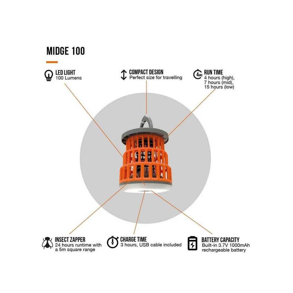 La lampada Midge 100 di Vango è una lampada piccola e pratica che aiuta a combattere gli insetti grazie alla luce UV che li attira e allo Zapper che li spegne. È inoltre dotato di un gancio per appendere per una maggiore facilità d'uso e flessibilità, ed è facile da riporre grazie alle sue dimensioni ridotte. Ha un tempo di ricarica di 3 ore ed è resistente all'acqua. Goditi le serate all'aria aperta senza preoccuparti dei fastidiosi insetti.