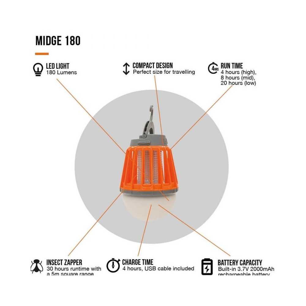 Il Vango Midge 180 è una pratica luce che permette di controllare gli insetti grazie alla luce UV che li attira e allo Zapper che li spegne. È inoltre dotato di un gancio per appendere per facilità d'uso e flessibilità ed è facile da riporre grazie alle sue dimensioni ridotte. Ha un tempo di ricarica di 3 ore ed è resistente all'acqua. Goditi le serate all'aria aperta senza preoccuparti dei fastidiosi insetti.